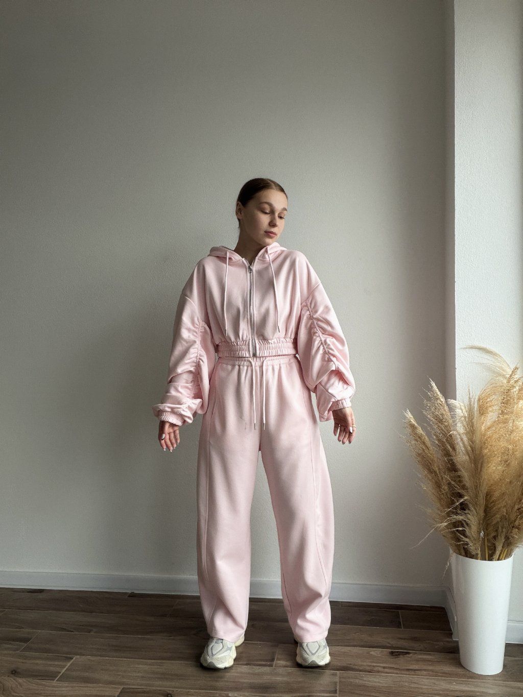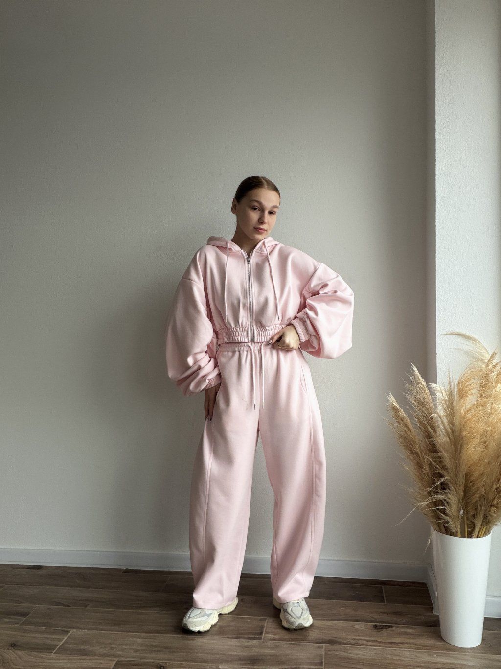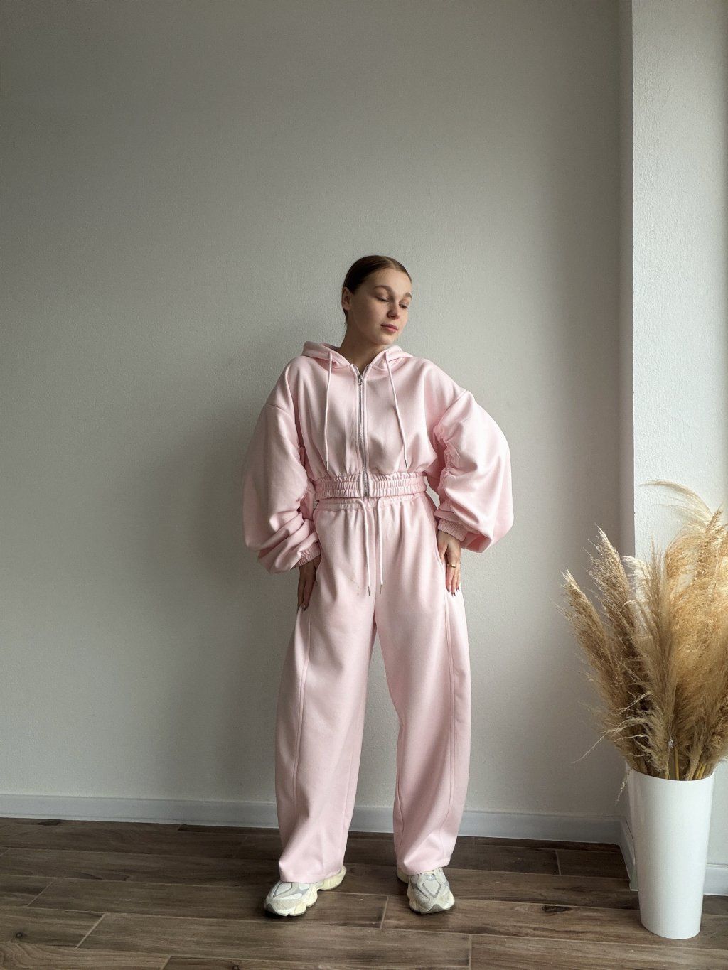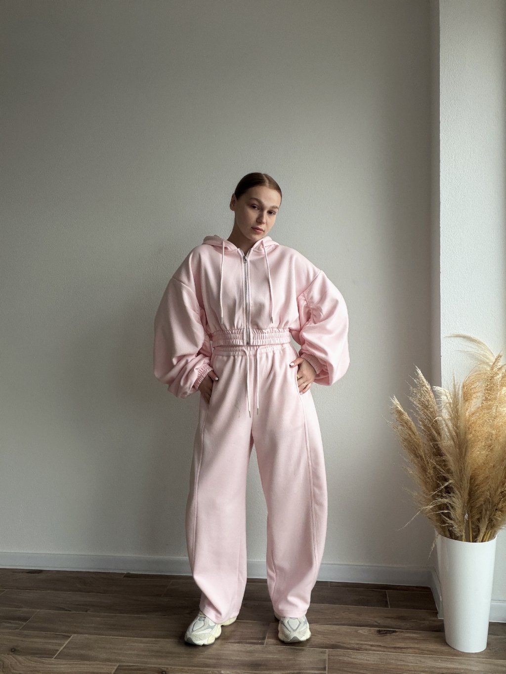 Pohodlná tepláková súprava s moderným oversized strihom, ktorá spája štýl a komfort v jednom. Mikina so zapínaním na zips má jemne nariasené a objemné rukávy zakončené manžetami, vďaka čomu pôsobí uvoľnene, ale stále upravene. Elastický pás v oblasti pása krásne zvýrazní siluetu bez obmedzovania pohybu.