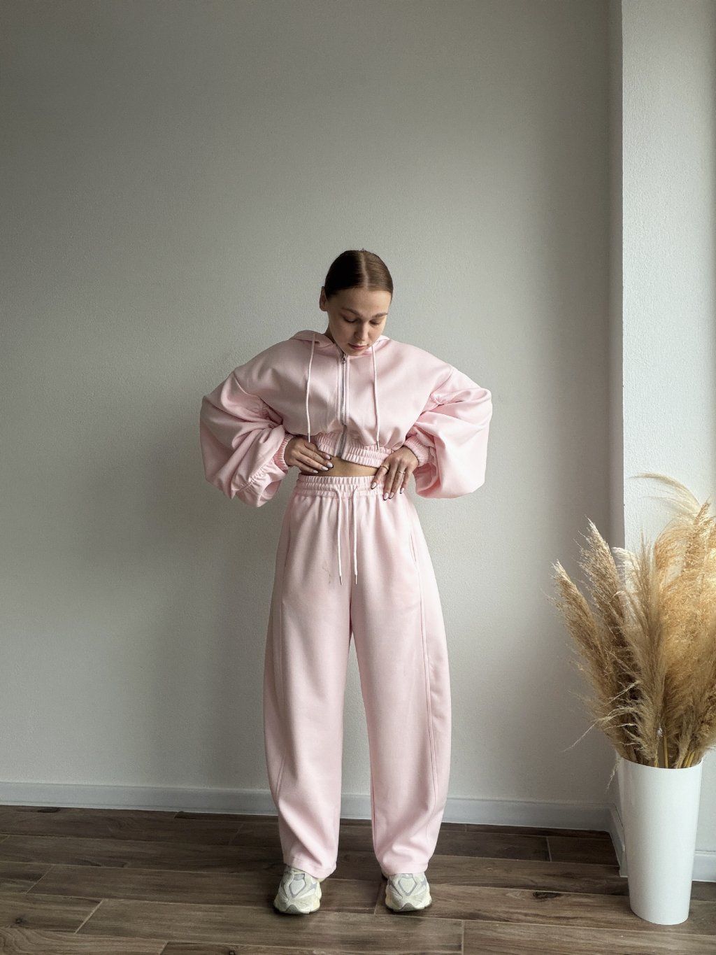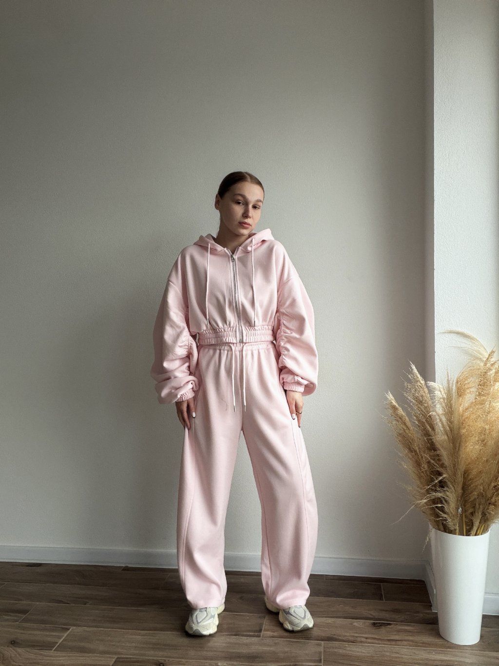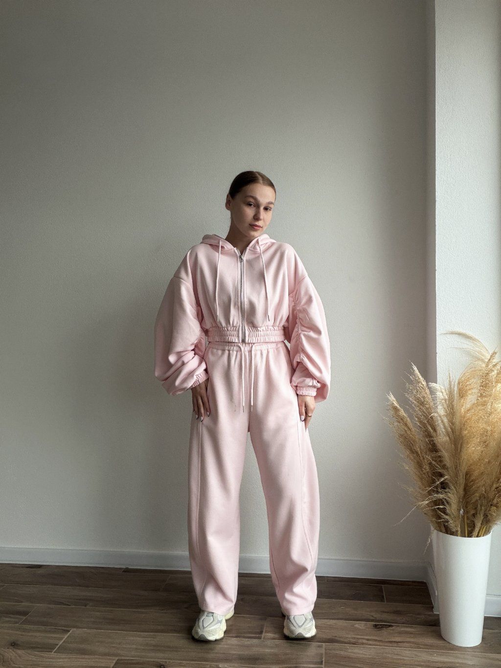 Pohodlná tepláková súprava s moderným oversized strihom, ktorá spája štýl a komfort v jednom. Mikina so zapínaním na zips má jemne nariasené a objemné rukávy zakončené manžetami, vďaka čomu pôsobí uvoľnene, ale stále upravene. Elastický pás v oblasti pása krásne zvýrazní siluetu bez obmedzovania pohybu.