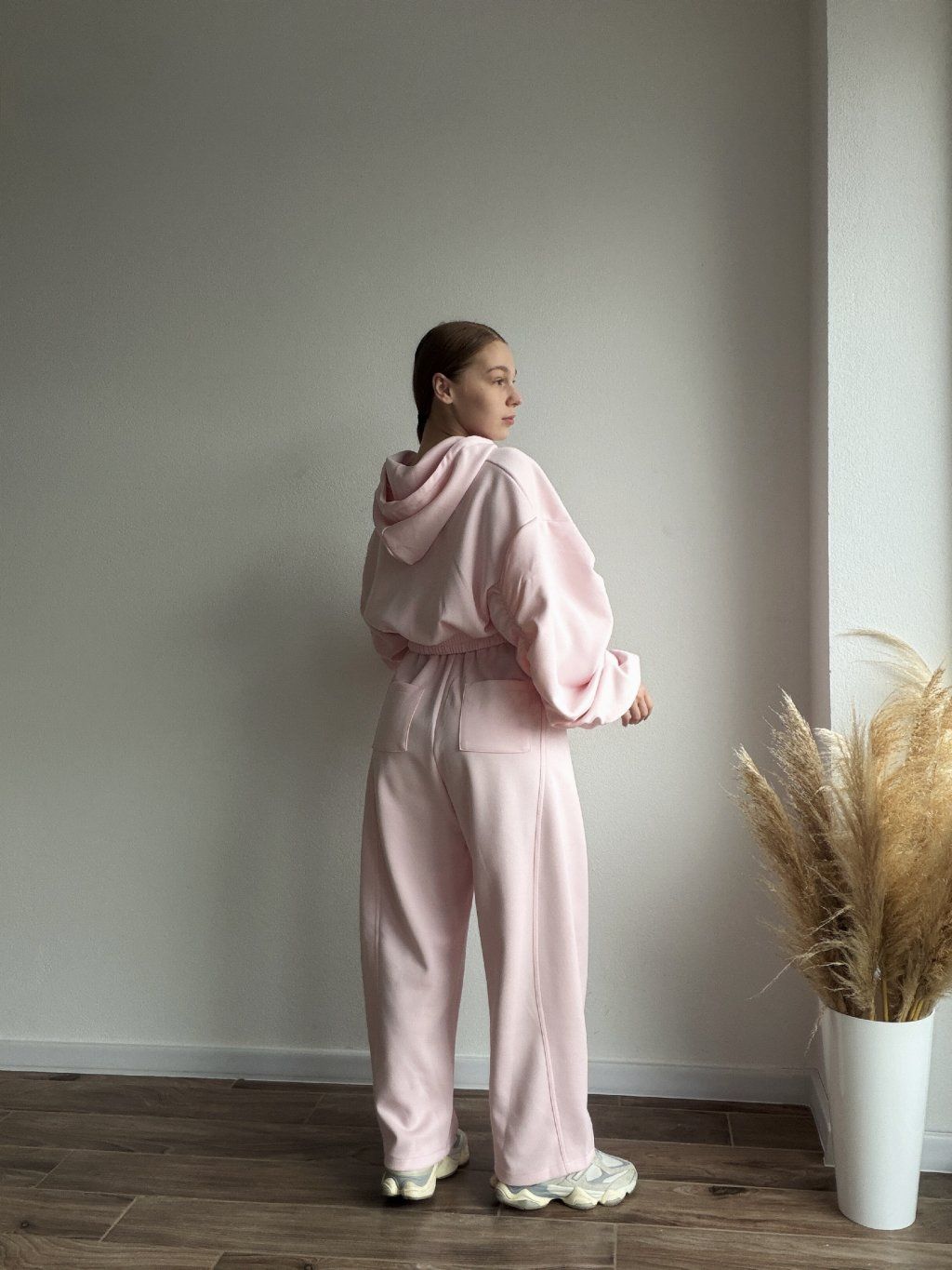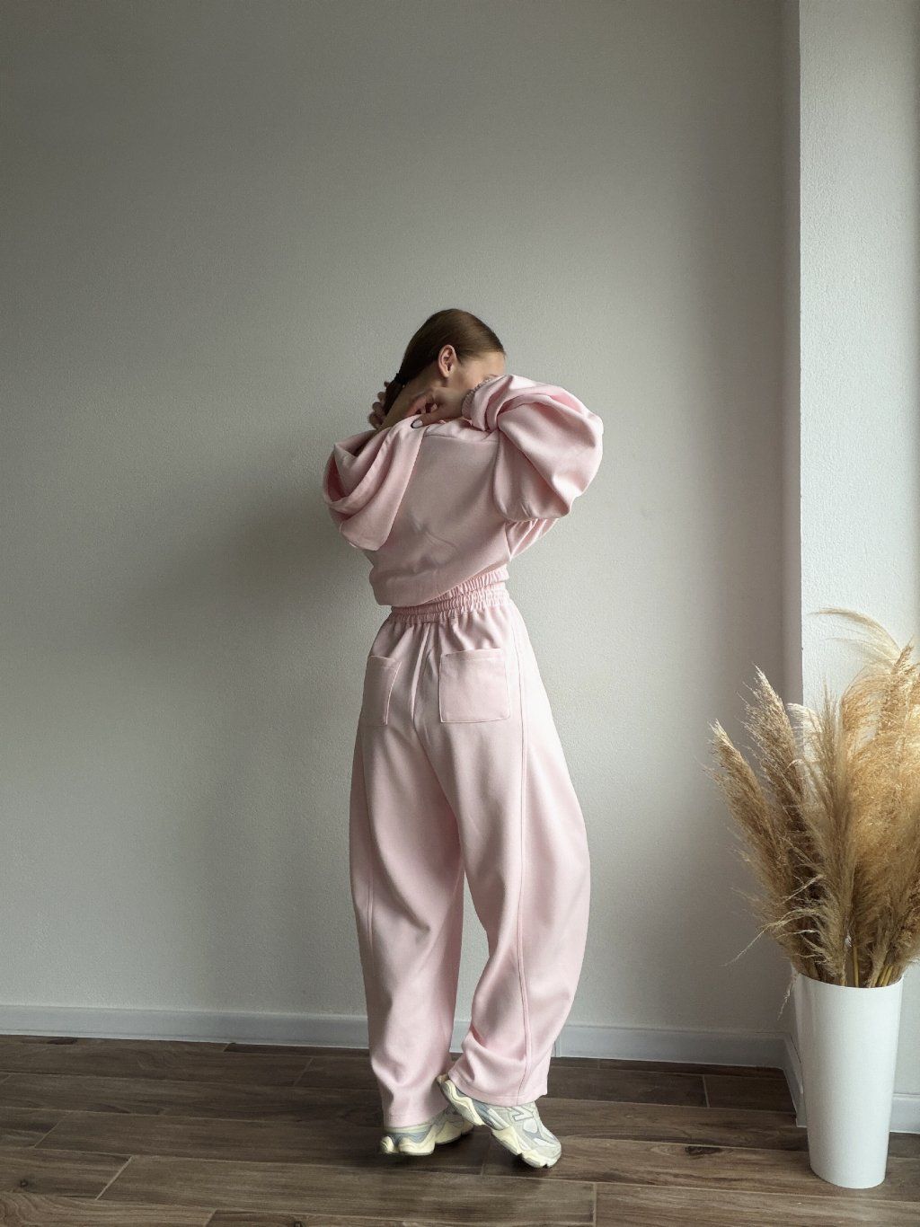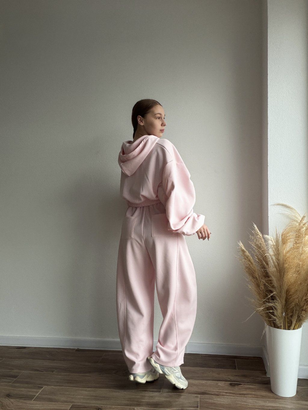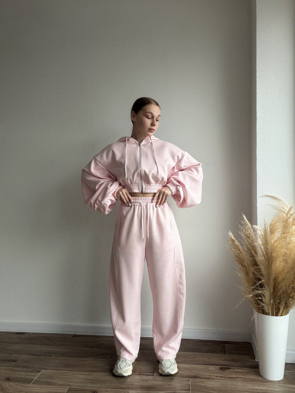 Pohodlná tepláková súprava s moderným oversized strihom, ktorá spája štýl a komfort v jednom. Mikina so zapínaním na zips má jemne nariasené a objemné rukávy zakončené manžetami, vďaka čomu pôsobí uvoľnene, ale stále upravene. Elastický pás v oblasti pása krásne zvýrazní siluetu bez obmedzovania pohybu.