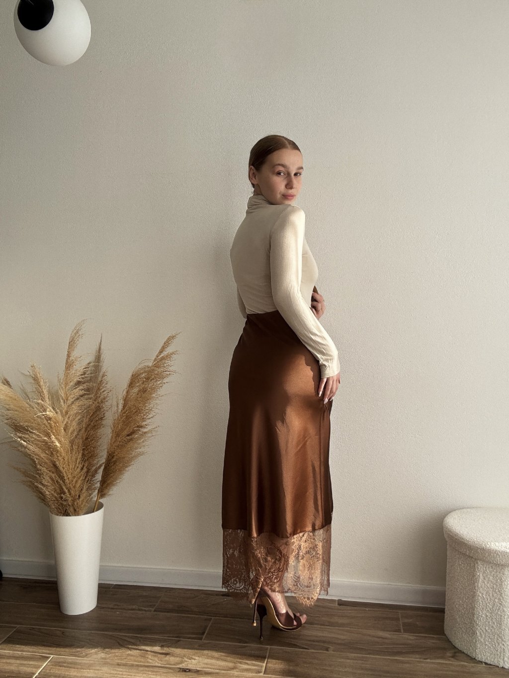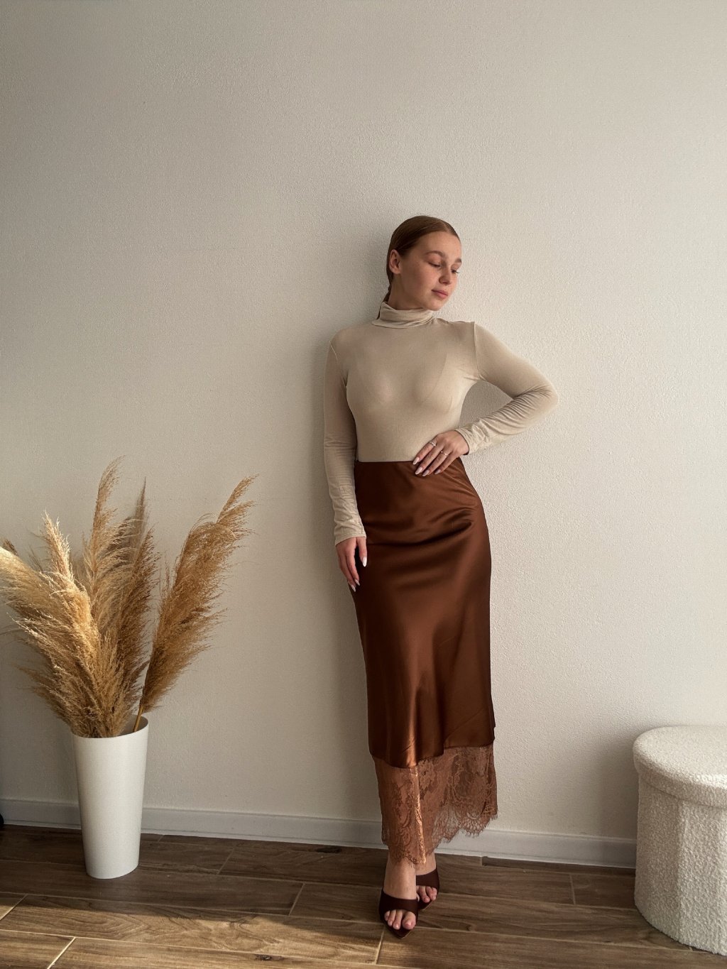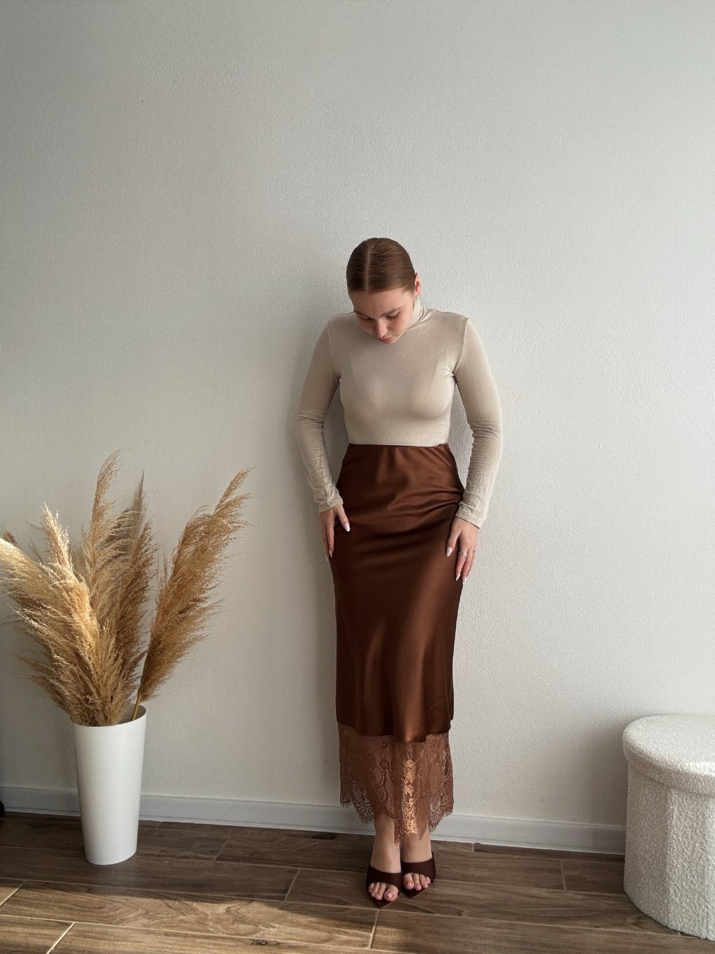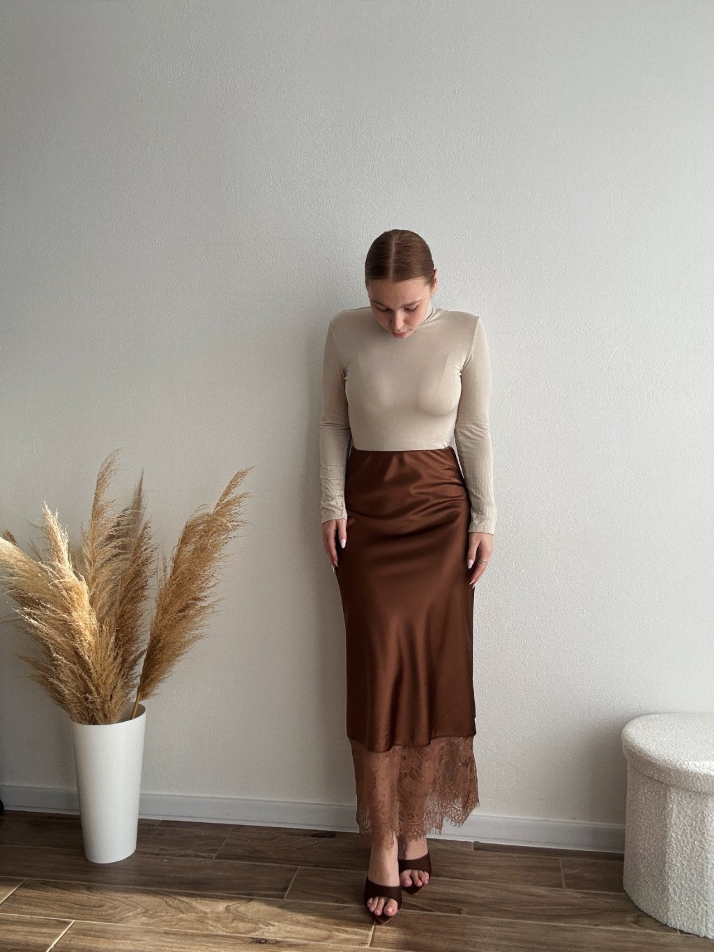Saténová sukňa s čipkou - SARAH - HNEDÁ